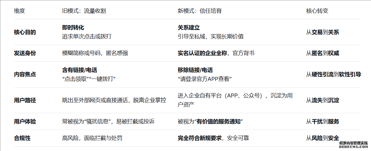 在通信監管日趨嚴格、用戶隱私意識覺醒的當下,那條曾被視為“直接觸達通道”的企業營銷短信,正站在變革的十字路口。2025年一系列新規的實施,并非簡單意義上的“限制”,而是一次深刻的行業價值重構。它促使企業必須告別過去廣撒網、強干擾的粗放模式,轉而將短信營銷升維為一個基于合規前提、信任基石與價值交互的精準溝通體系。企業若想在其中贏得先機,關鍵在于實現三大核心轉變。
